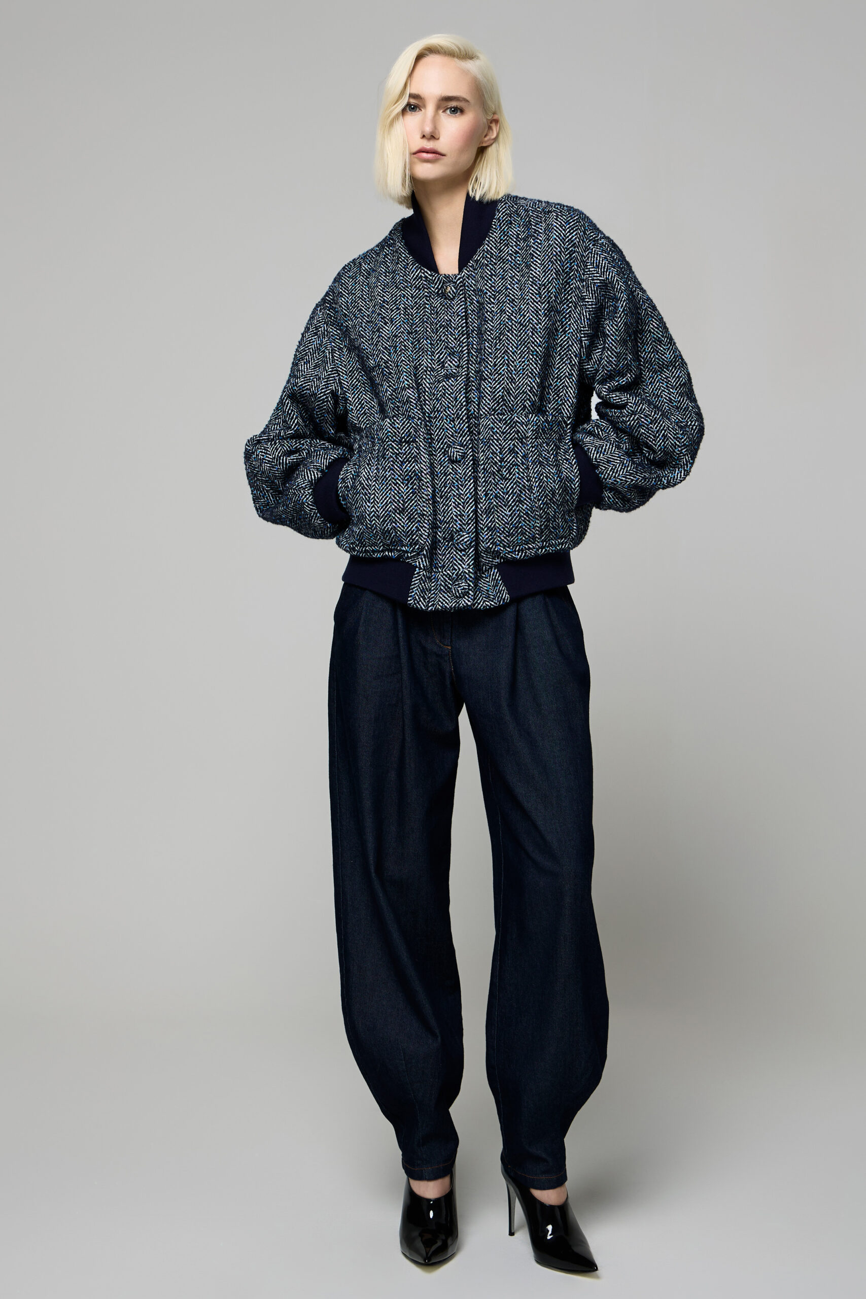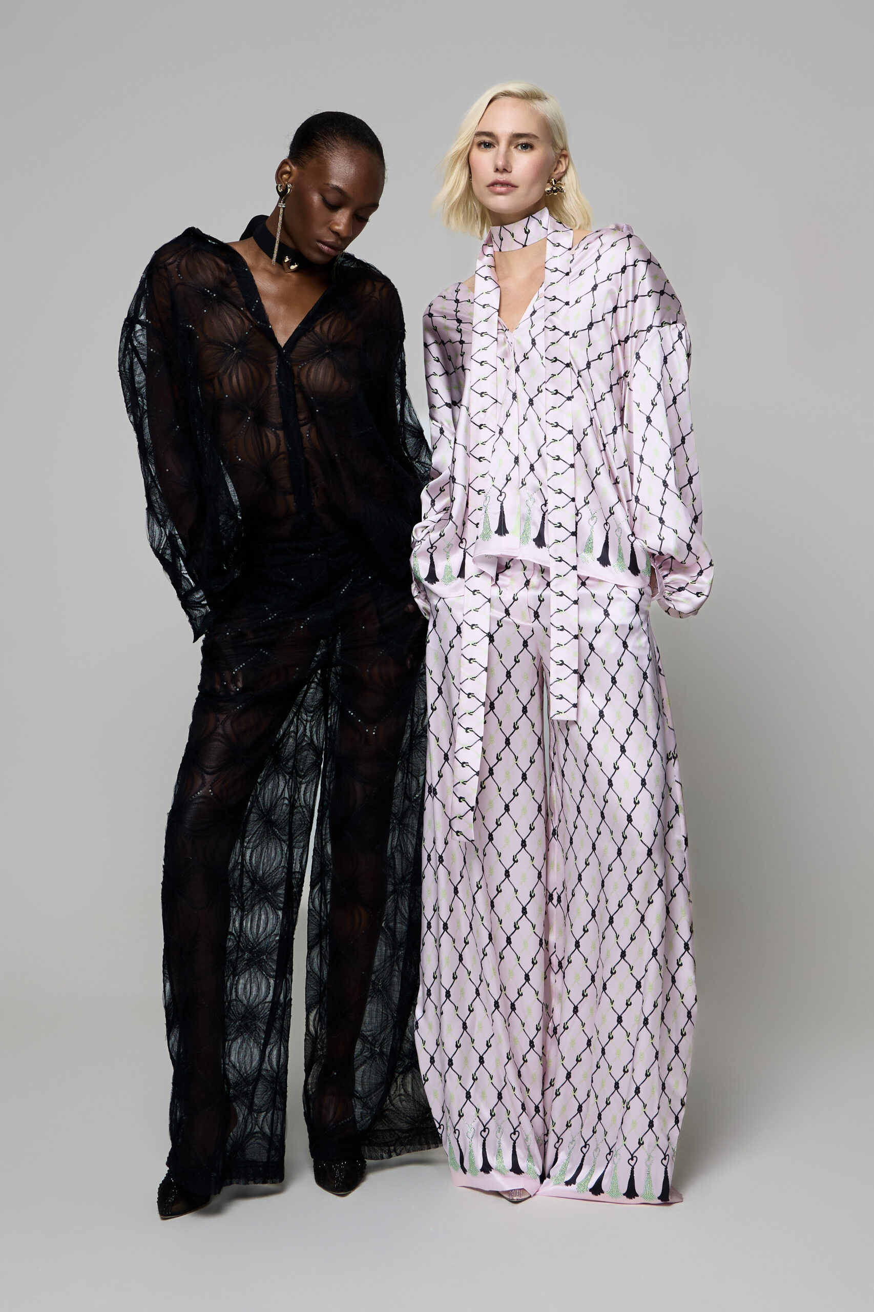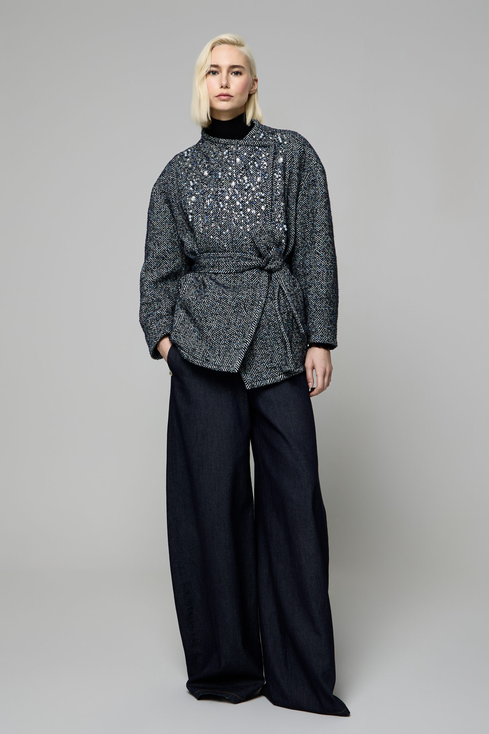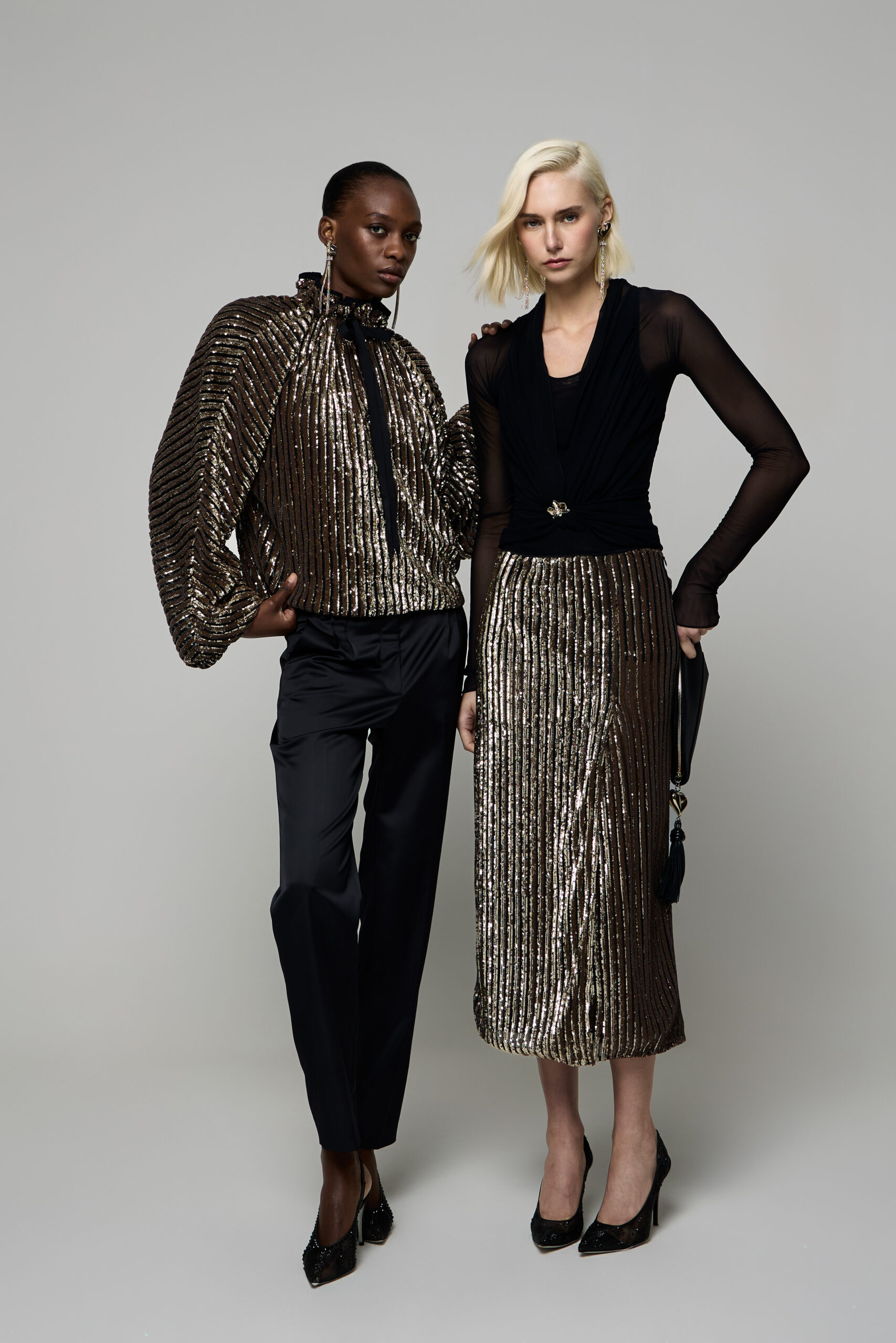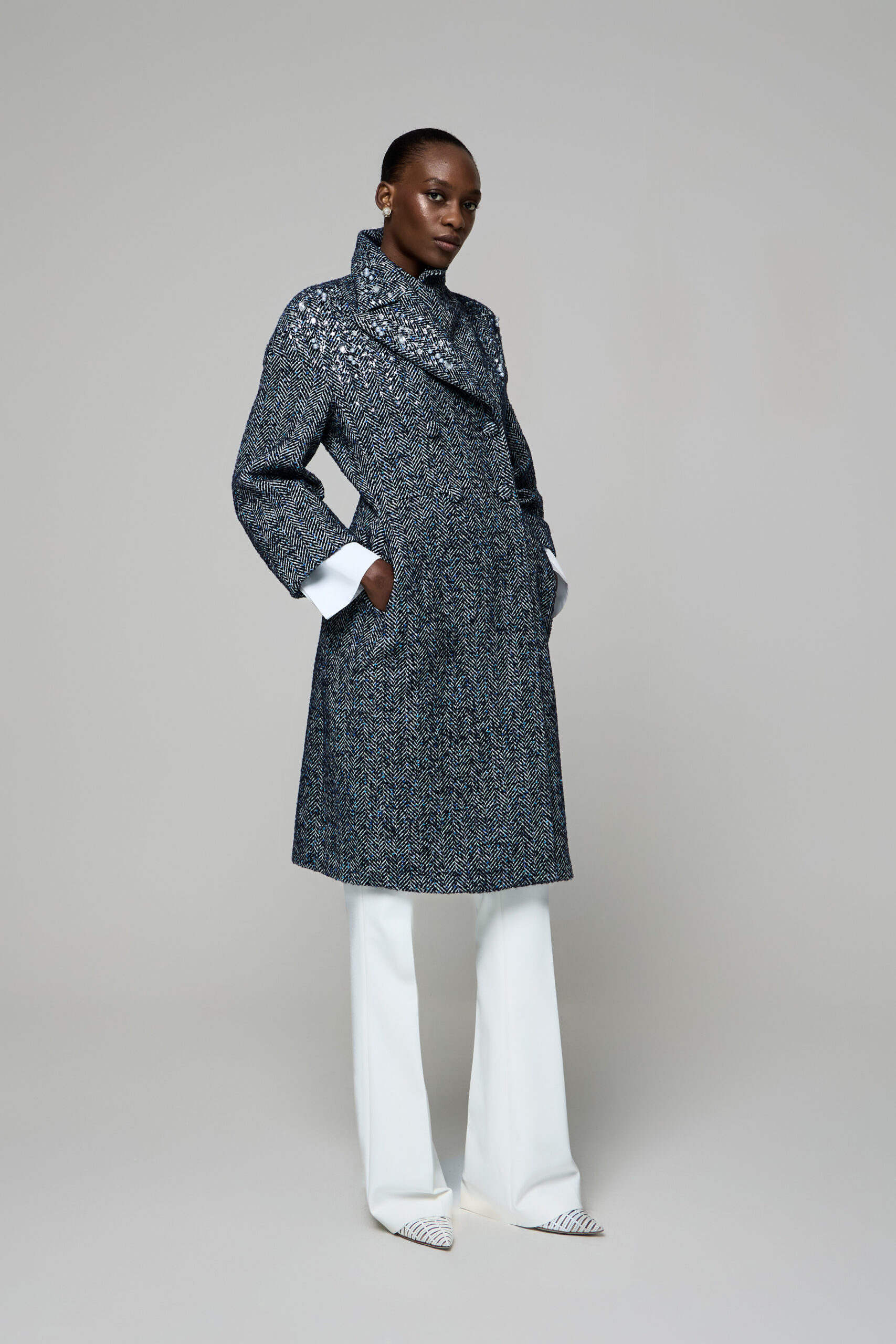 I tessuti pregiati sono protagonisti: tweed ricamato illuminato da micro-dettagli scintillanti, gessato in lana reinterpretato in chiave morbida e attuale, cachemire impalpabili che avvolgono in stratificazioni leggere e calde e sete fluide che donano profondità visiva.