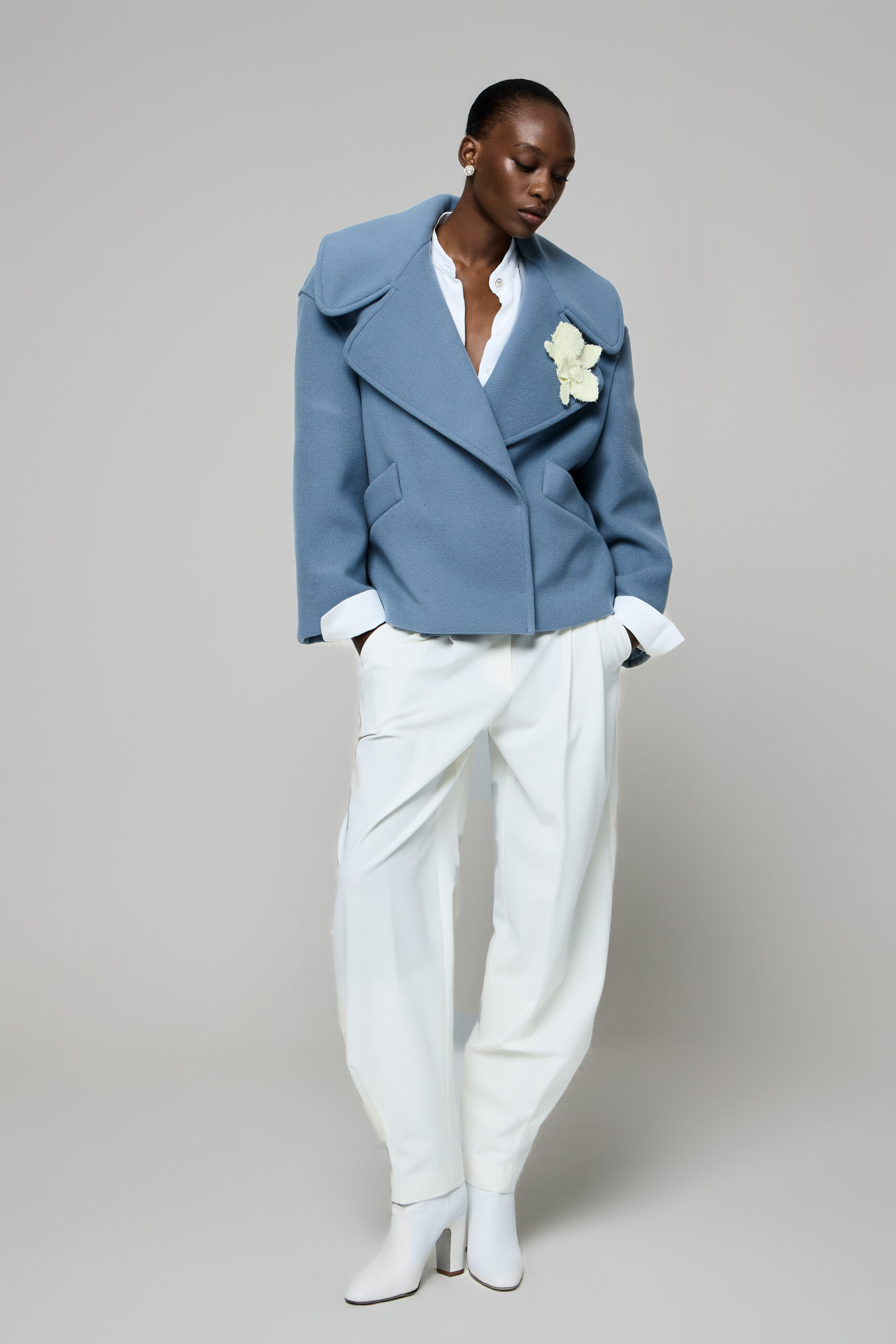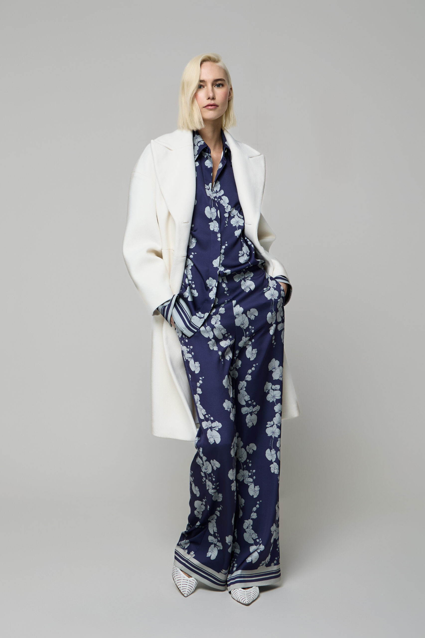 La palette cromatica si muove tra tonalità sobrie e luminose, mentre le silhouette nette e fluide accompagnano il corpo con naturalezza, delineando una femminilità sicura e consapevole.