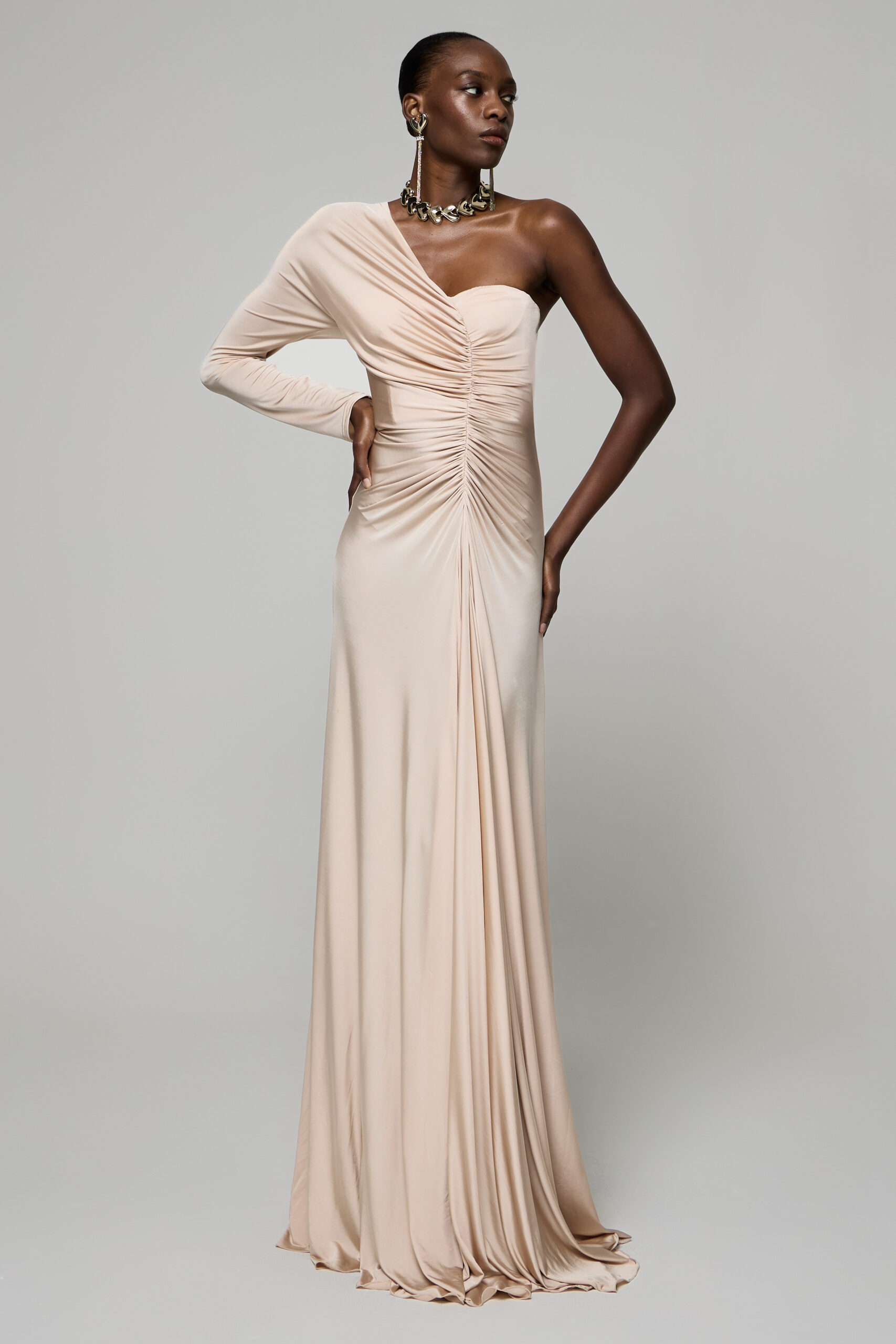 Il culmine si esprime nell’eveningwear, dove leggerezza, ricamo e fluidità architettonica definiscono abiti di rara eleganza: dal raso di seta bianca illuminato da una cascata di micro-perle al lungo abito in georgette avvolto da drappeggi e inserti preziosi, fino alle proposte in oro e nero dall’allure scultorea e alla cappa in bouclé rosa cipria ricamata con micro-perle dorate, manifesto di una femminilità che sa coniugare protezione e splendore.