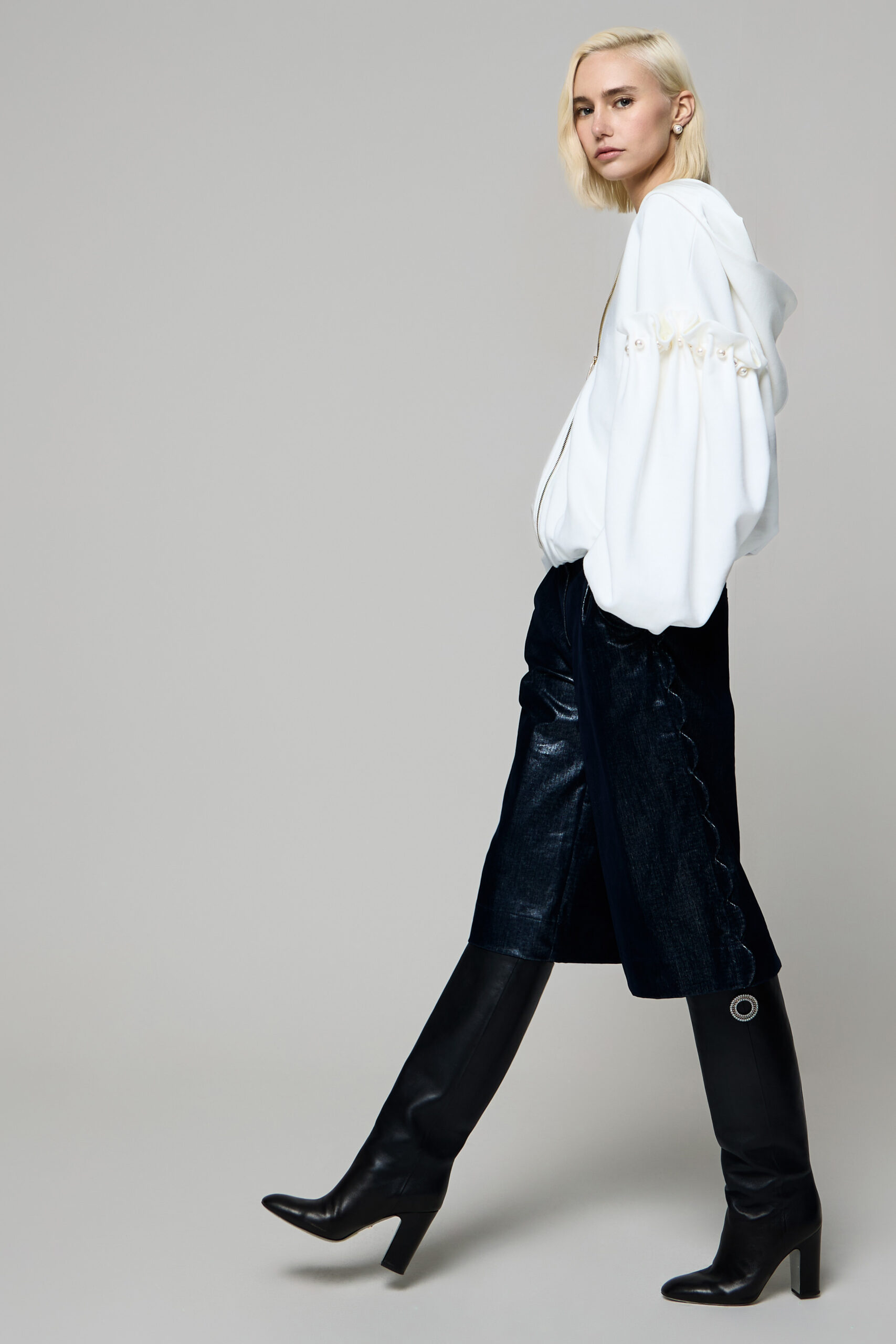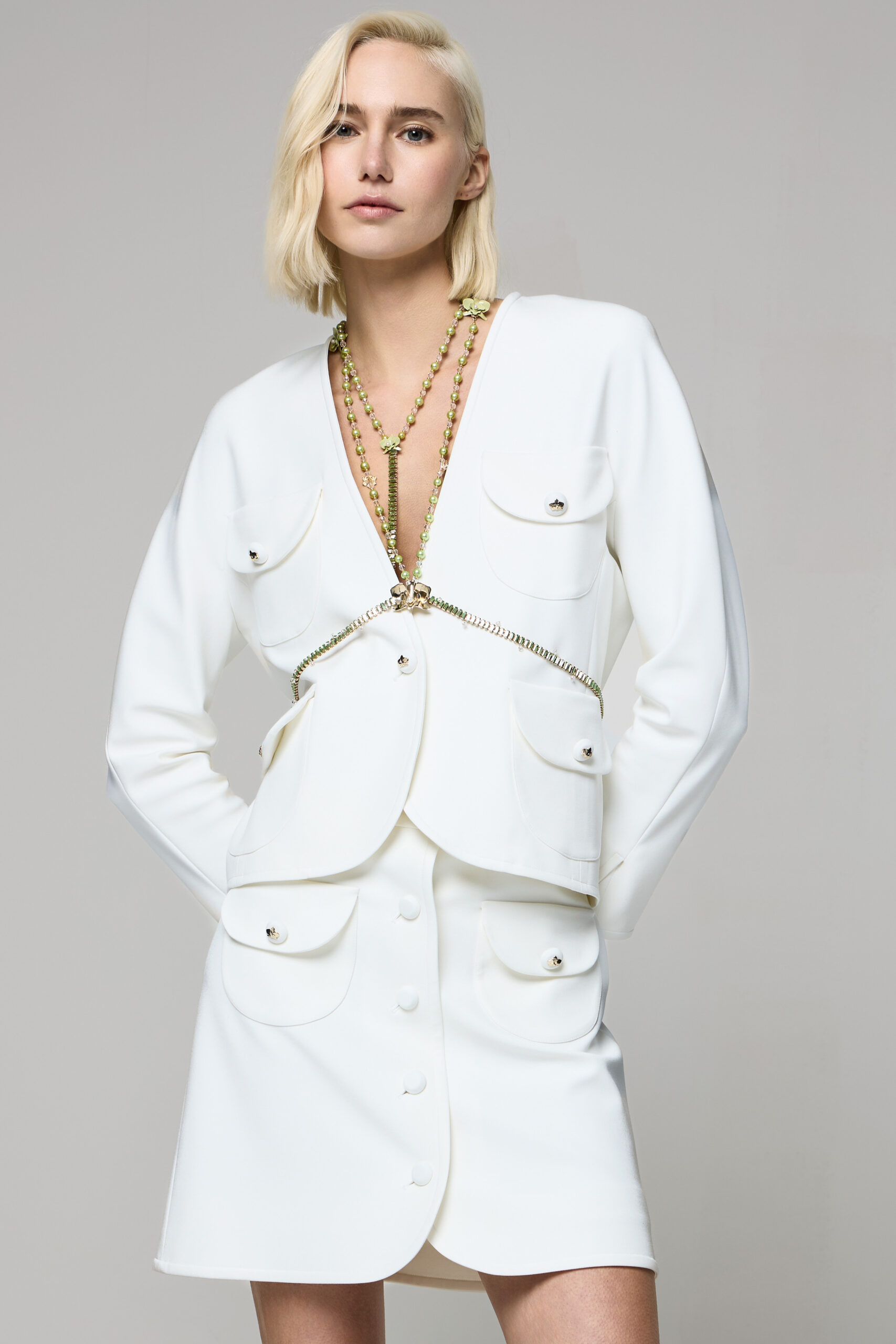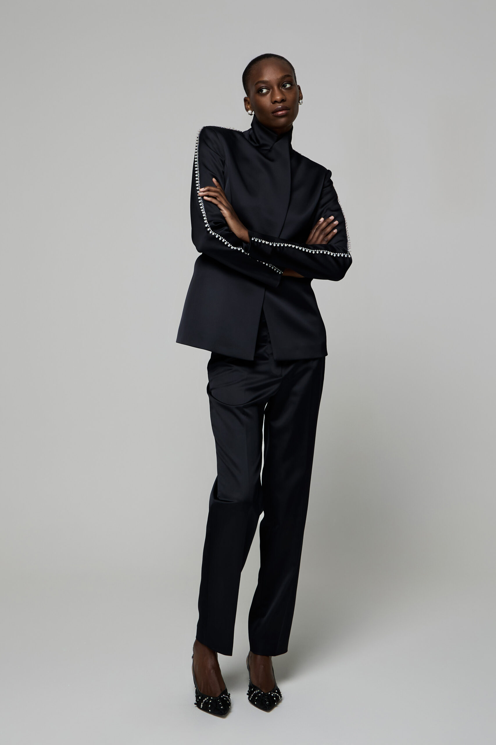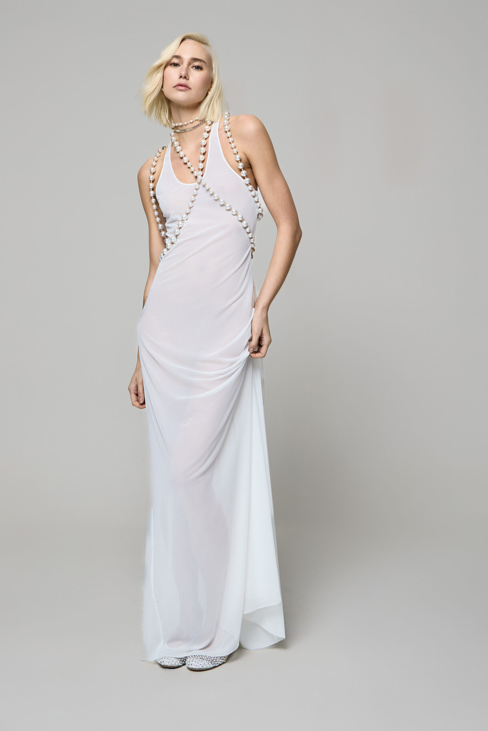 A impreziosire le superfici interviene il codice decorativo della maison, con perle applicate con estrema finezza e ricami minuti che trasformano ogni capo in un simbolo di sofisticata modernità, evocando un lusso intimo e discreto.