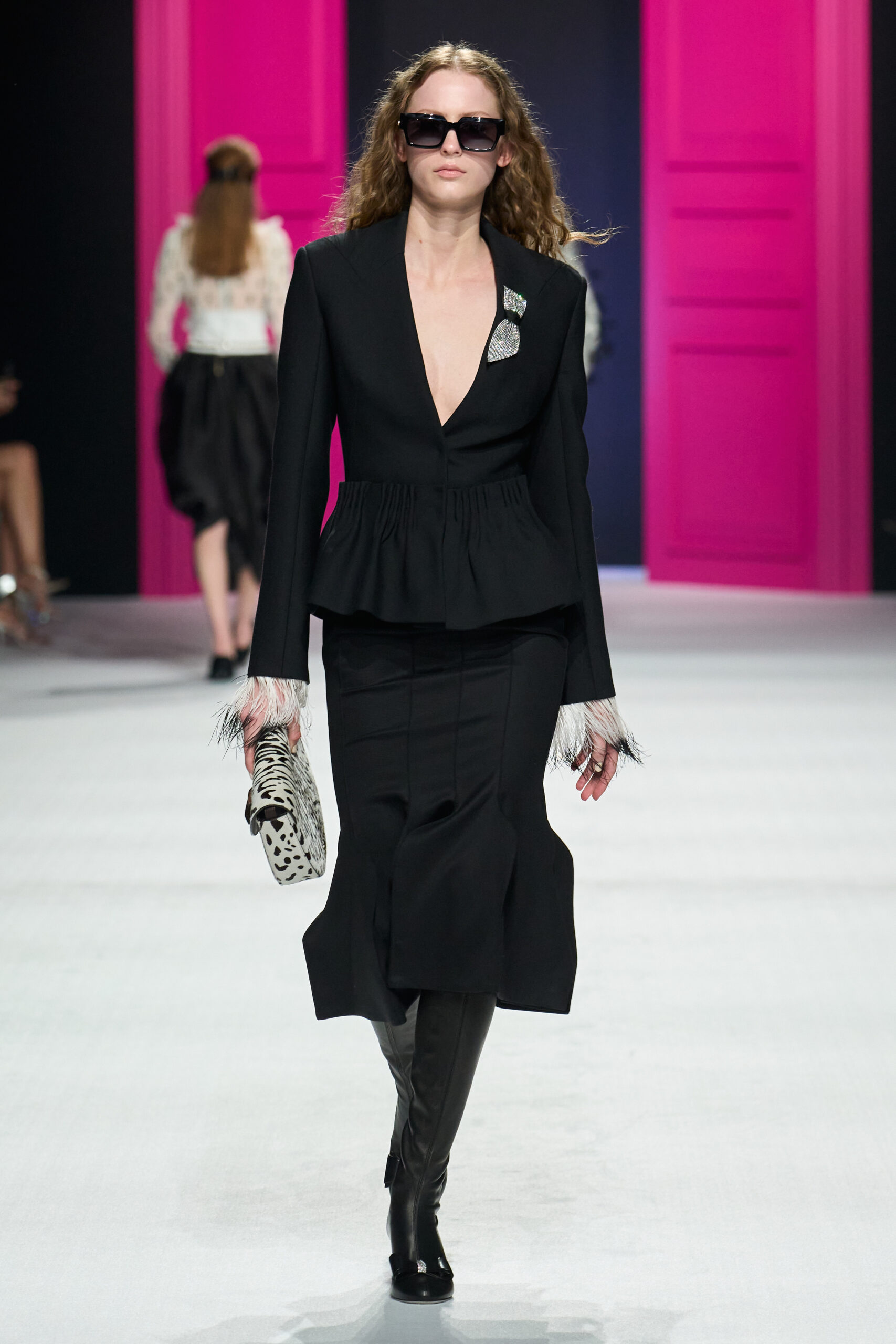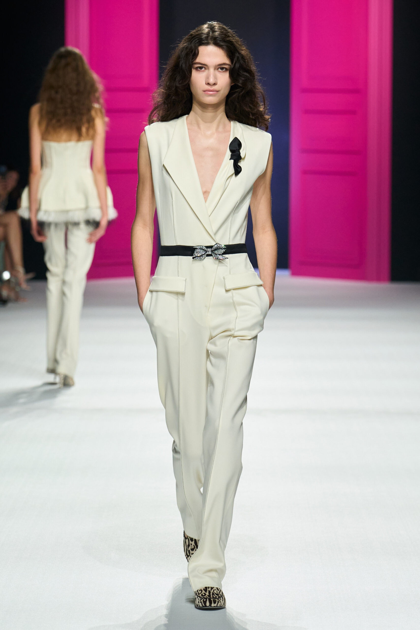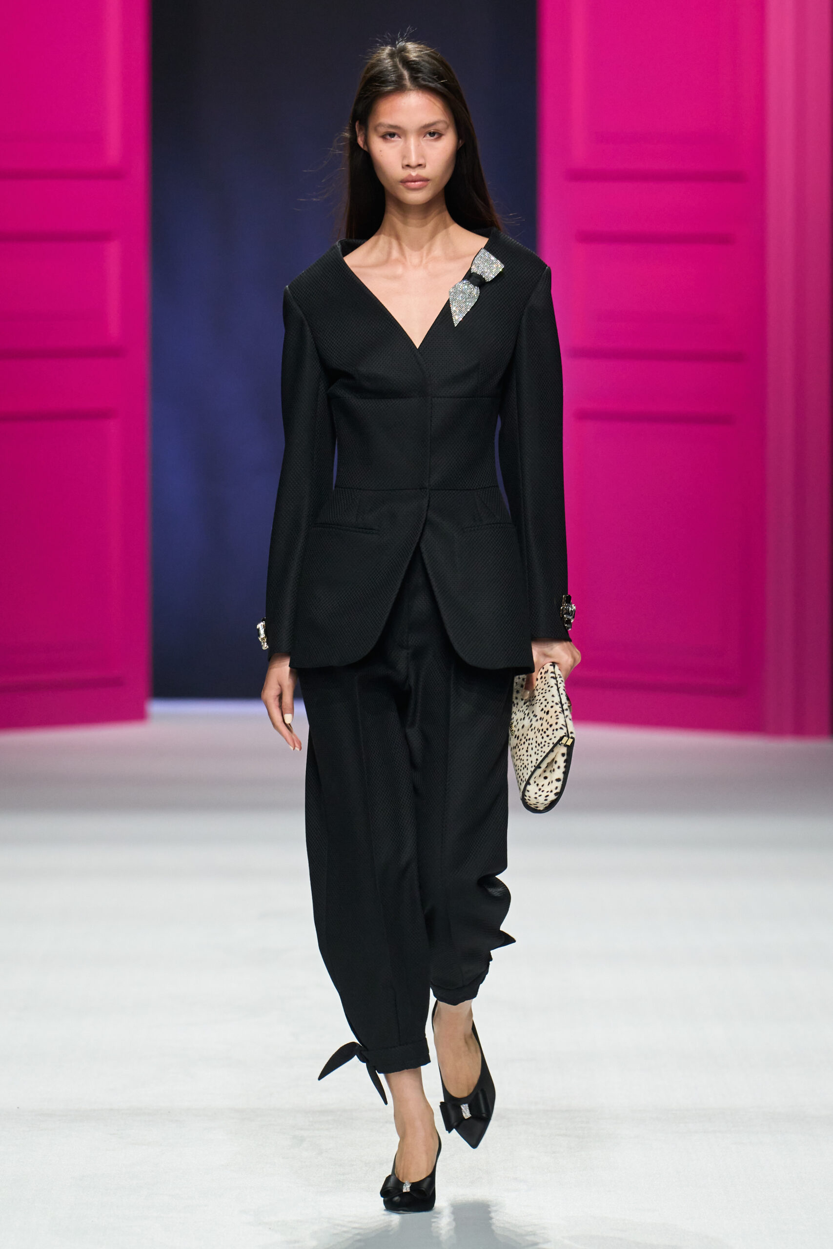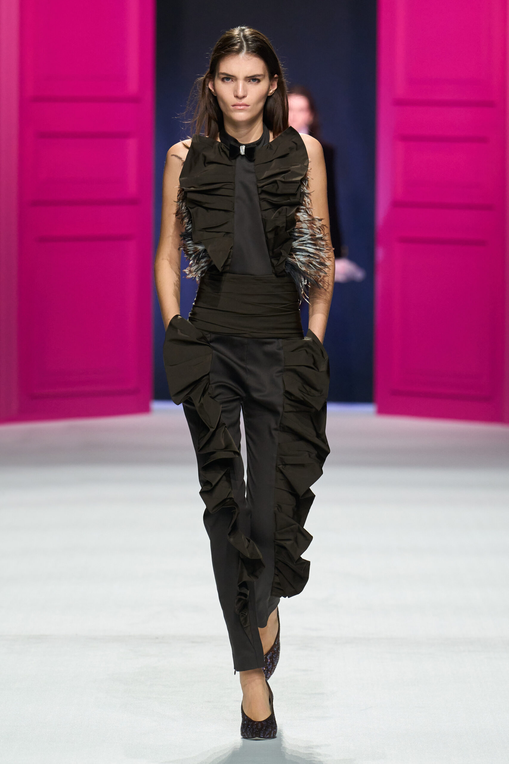 Invece i volant sostituiscono i revers di un’impeccabile giacca allungata sui fianchi e disegnano i contorni di una sensuale tuta con i pantaloni a sigaretta.