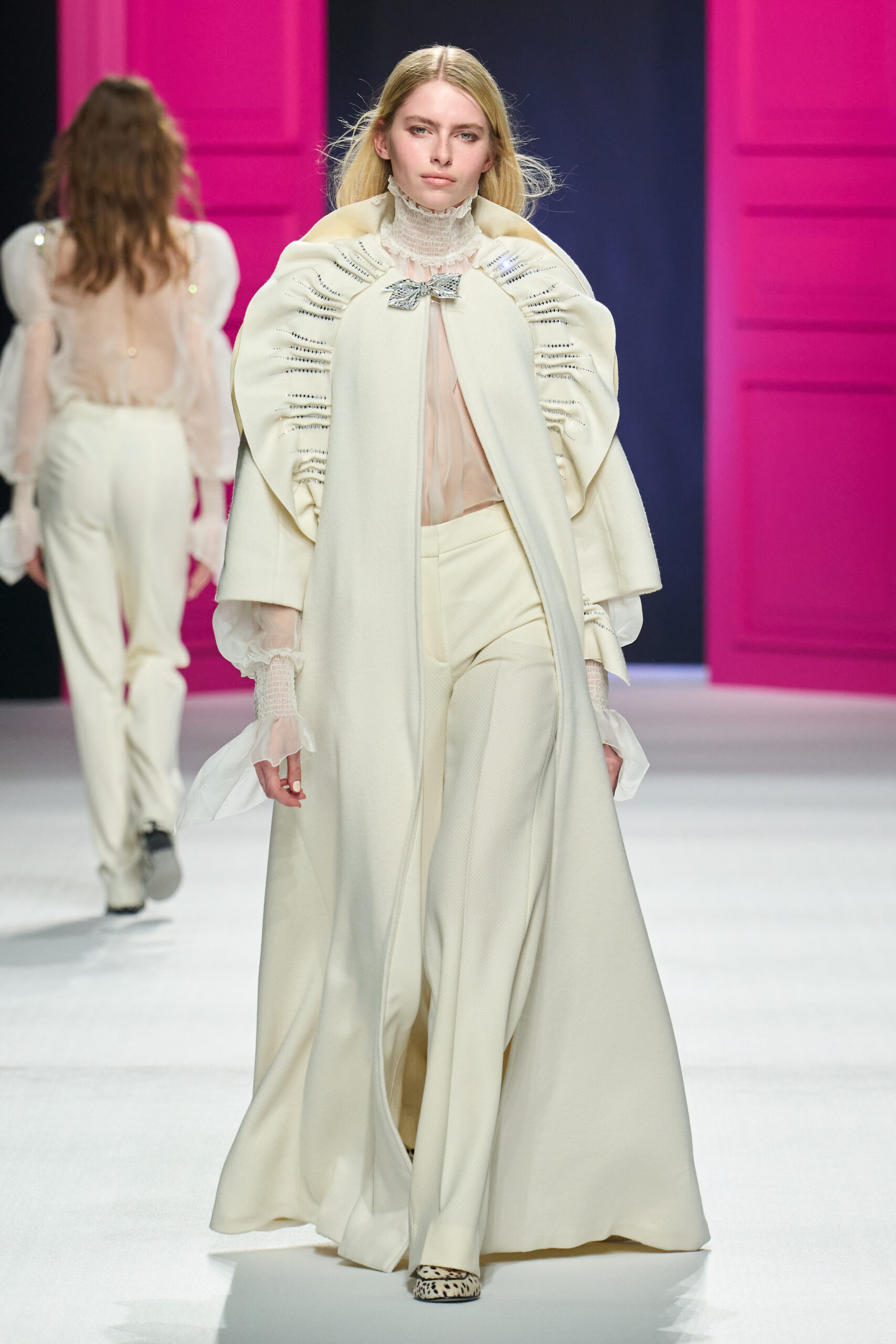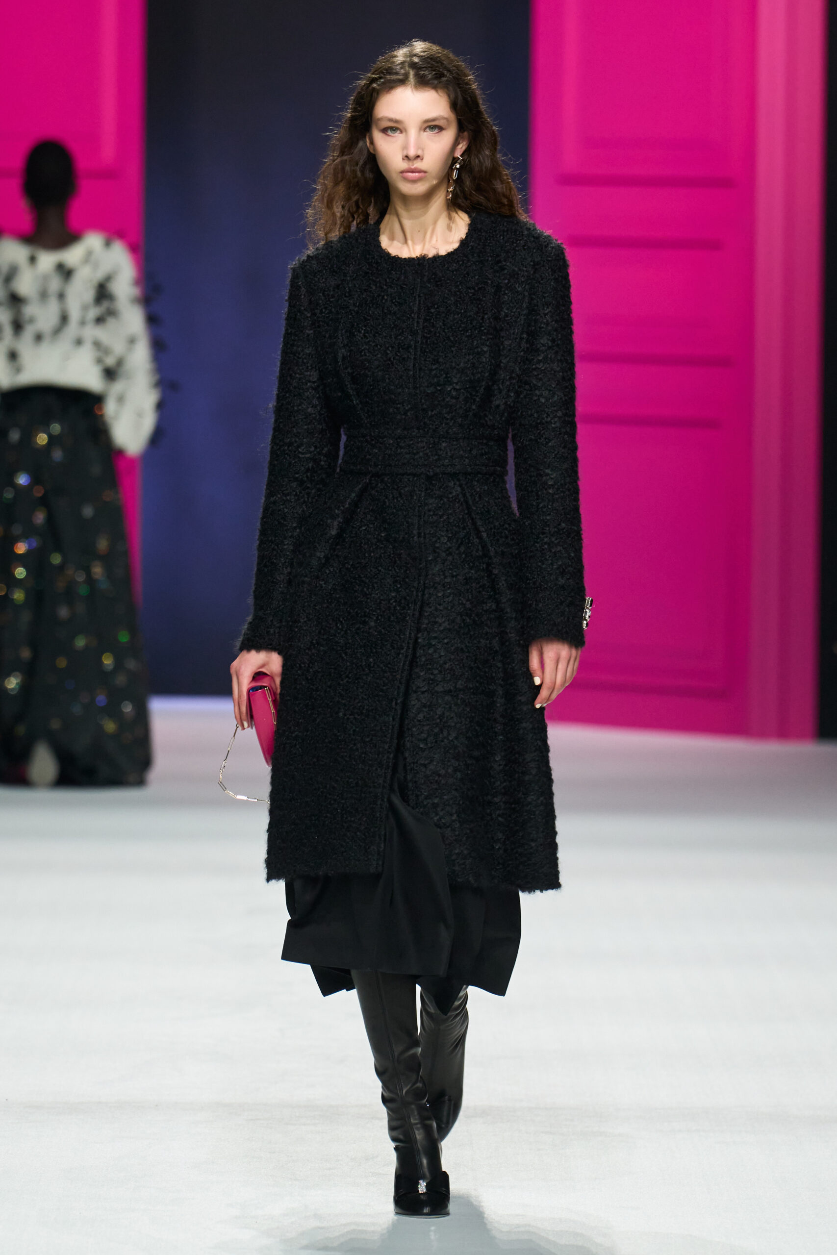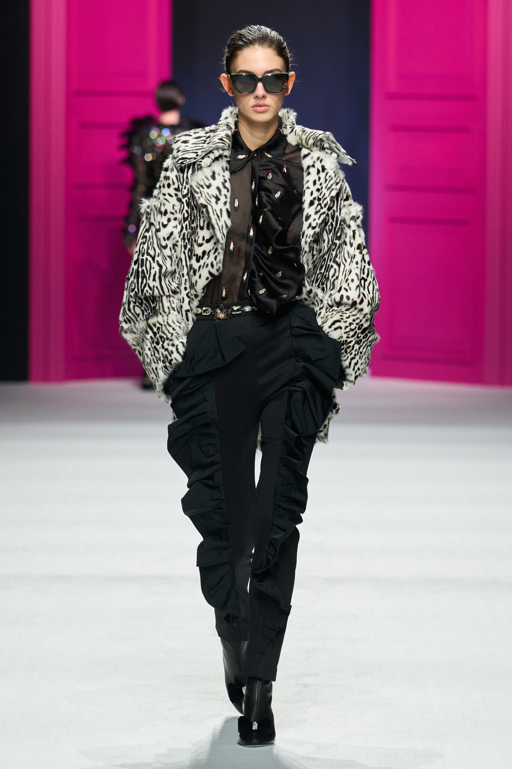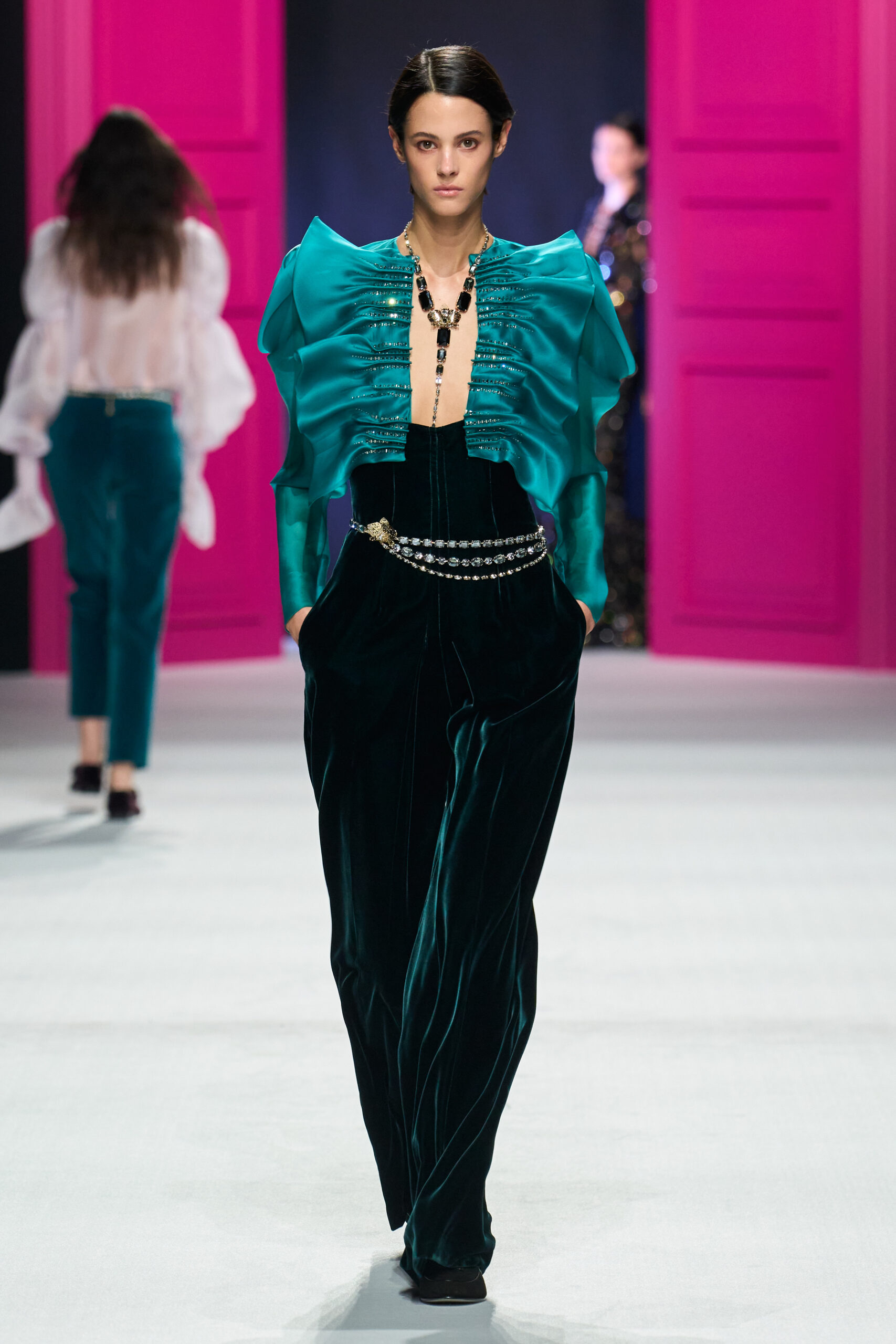 Invece i volant sostituiscono i revers di un’impeccabile giacca allungata sui fianchi e disegnano i contorni di una sensuale tuta con i pantaloni a sigaretta.