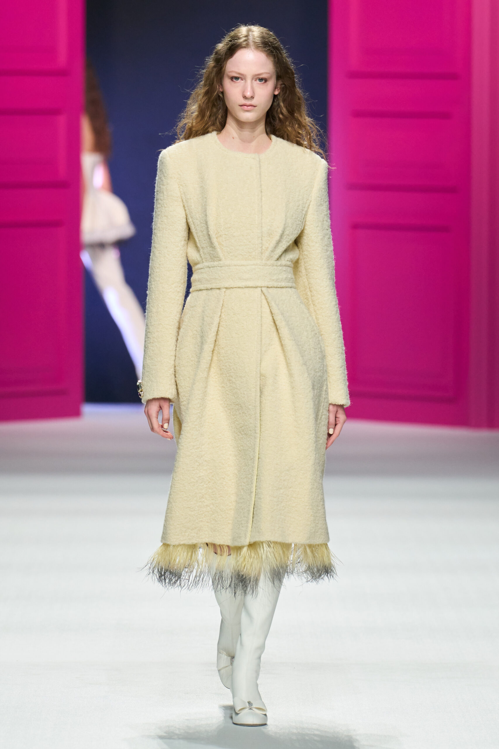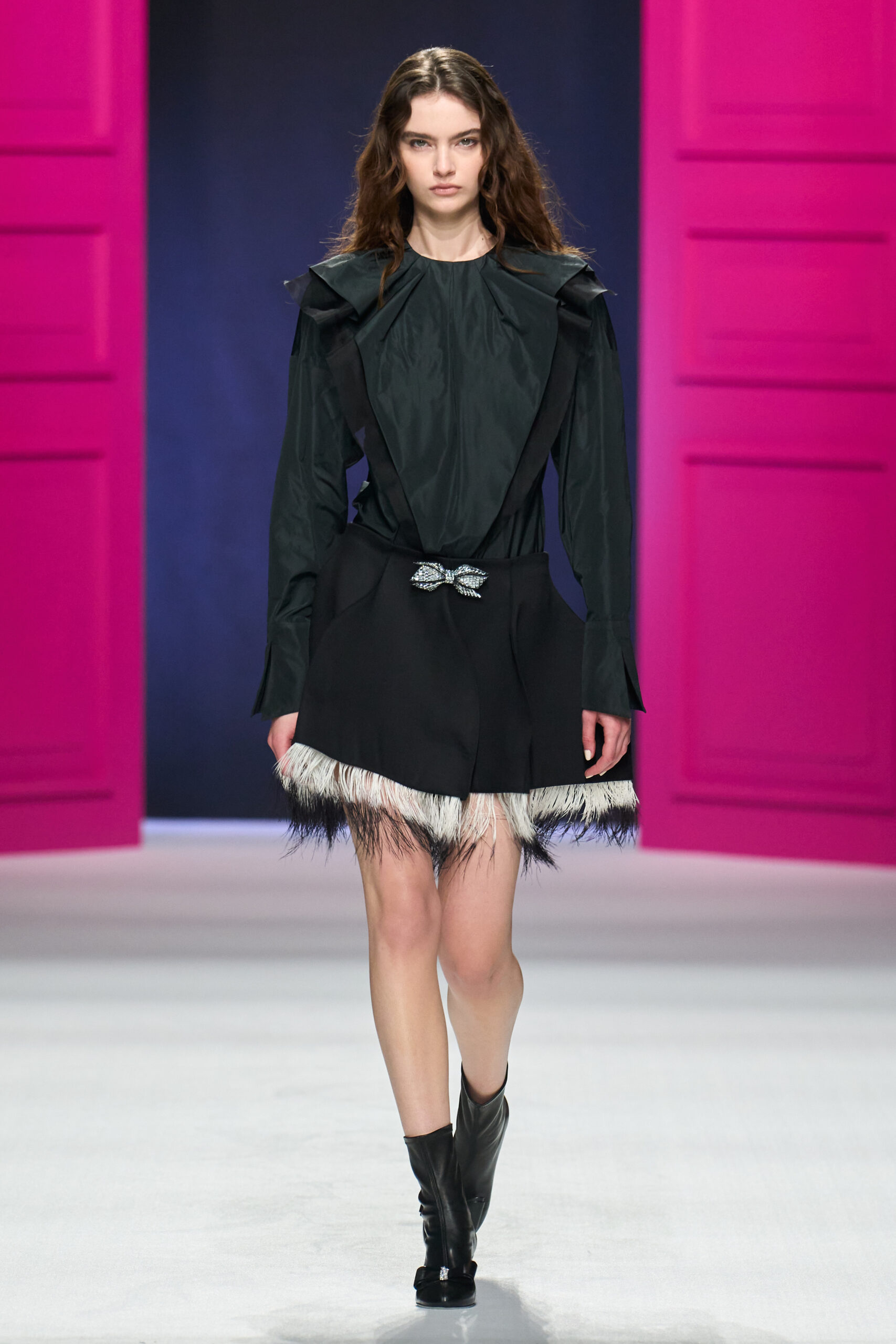 Feathers are not nostalgic ornamentation but living material: they rest on structured tops and envelop coats with theatrical lightness, creating movement that contrasts with the rigidity of tailoring. They are accents of air within the construction.
