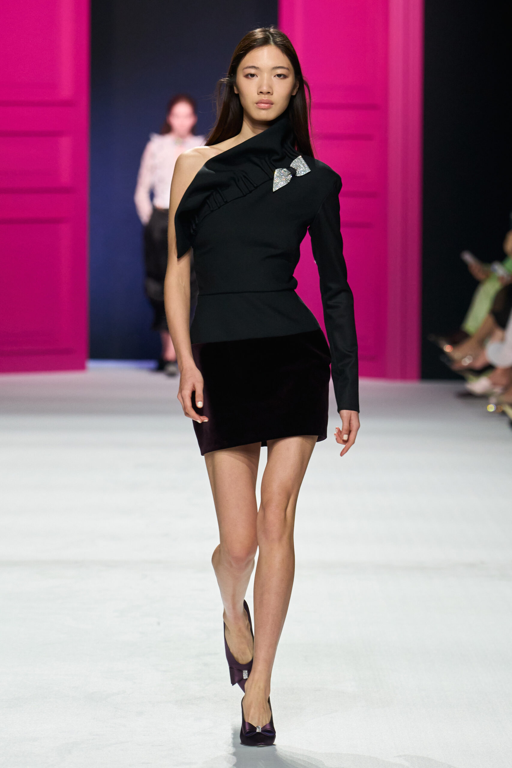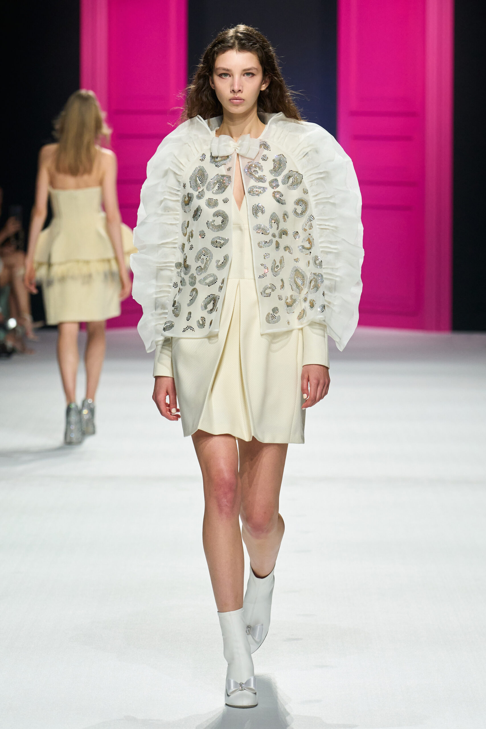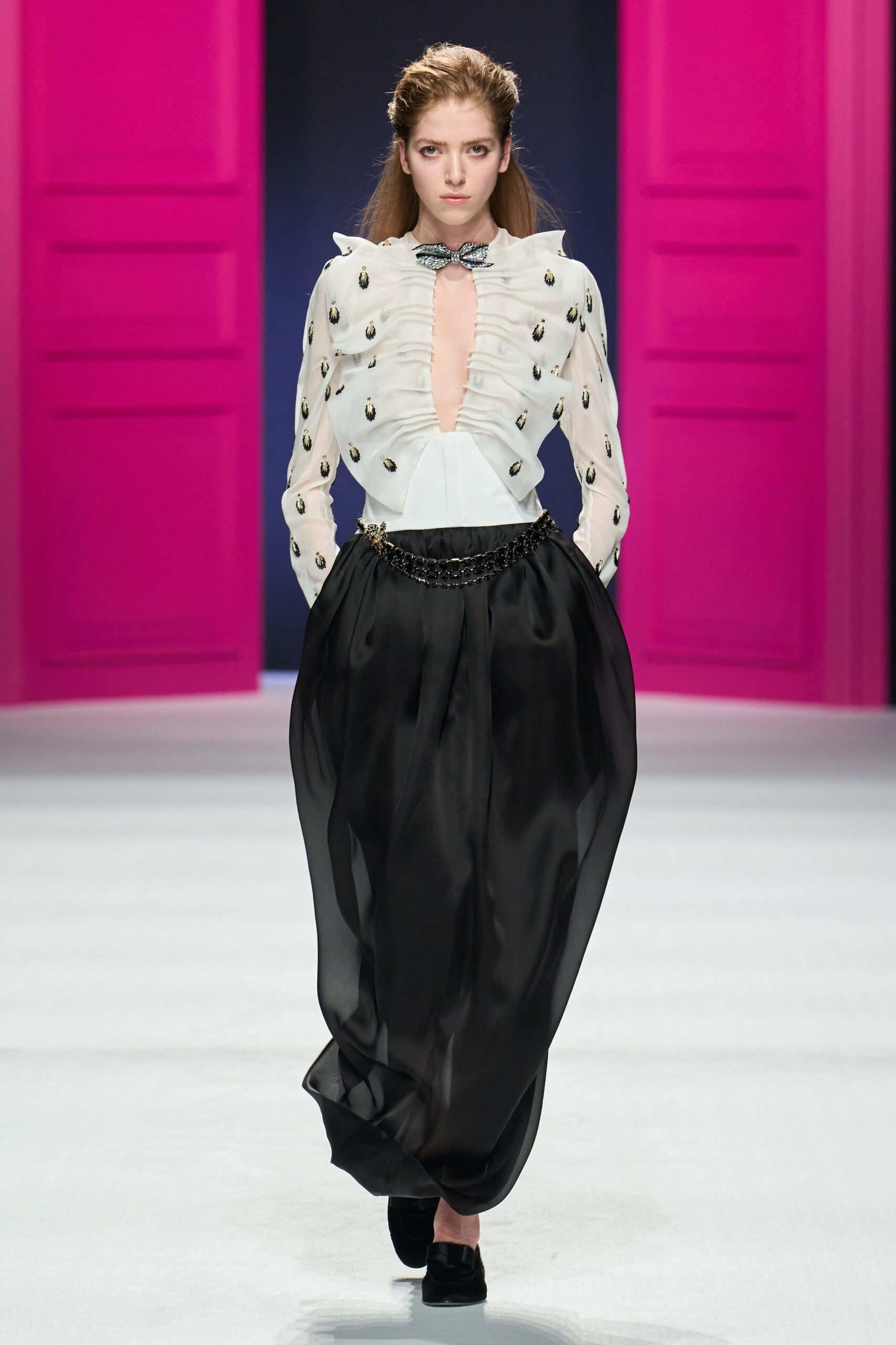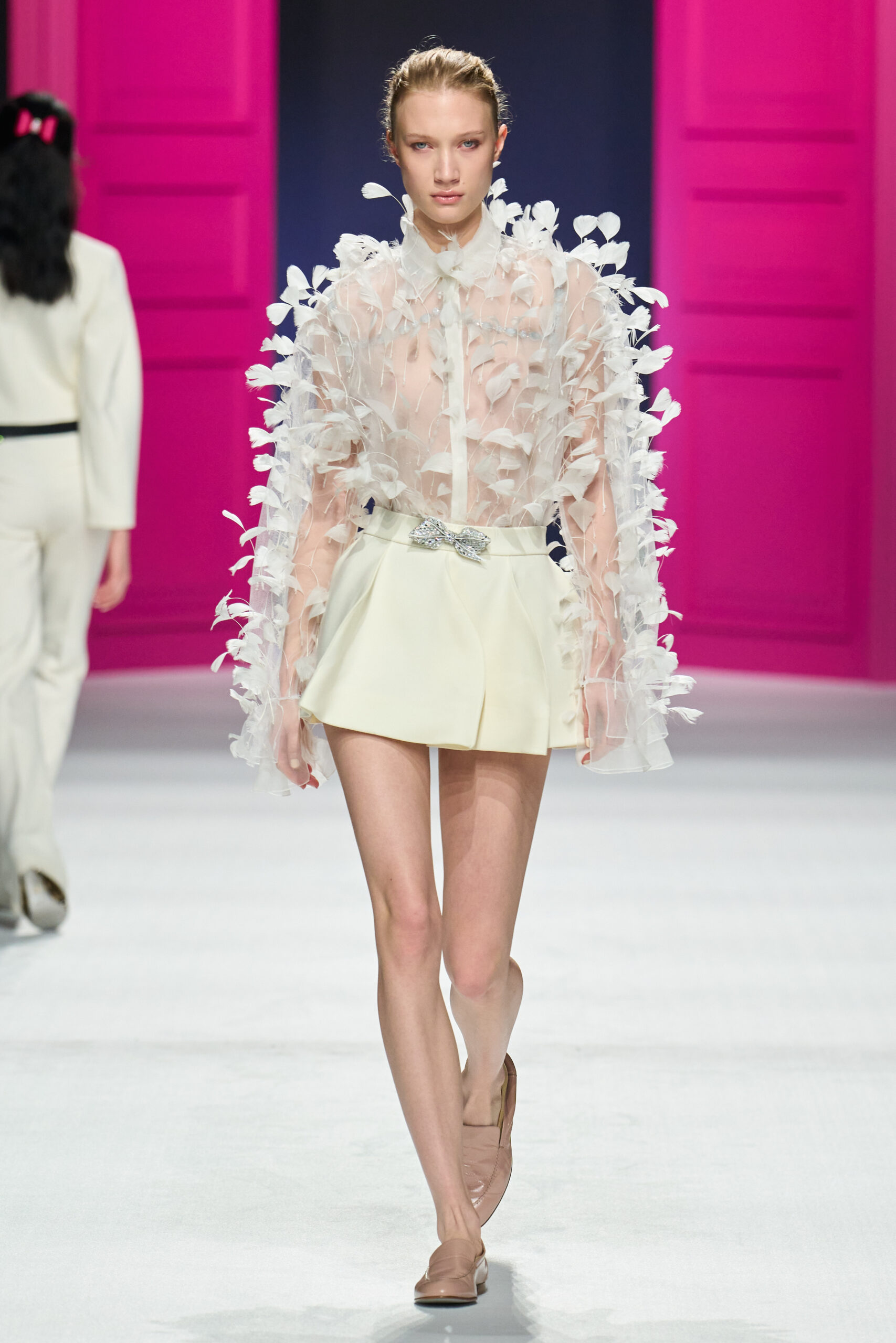 Petali tridimensionali si trasformano in gonne-corolla con volumi che si aprono come architetture botaniche. Il busto rimane asciutto e controllato mentre la parte inferiore esplode nella geometria variabile della natura. Ci sono fiocchi e volant. I primi vengono trasformati in dettagli sartoriali che sostituiscono l’allacciatura di una sensuale camicia bianca dal taglio maschile oppure si allacciano sui revers di una raffinata giacca da smoking.