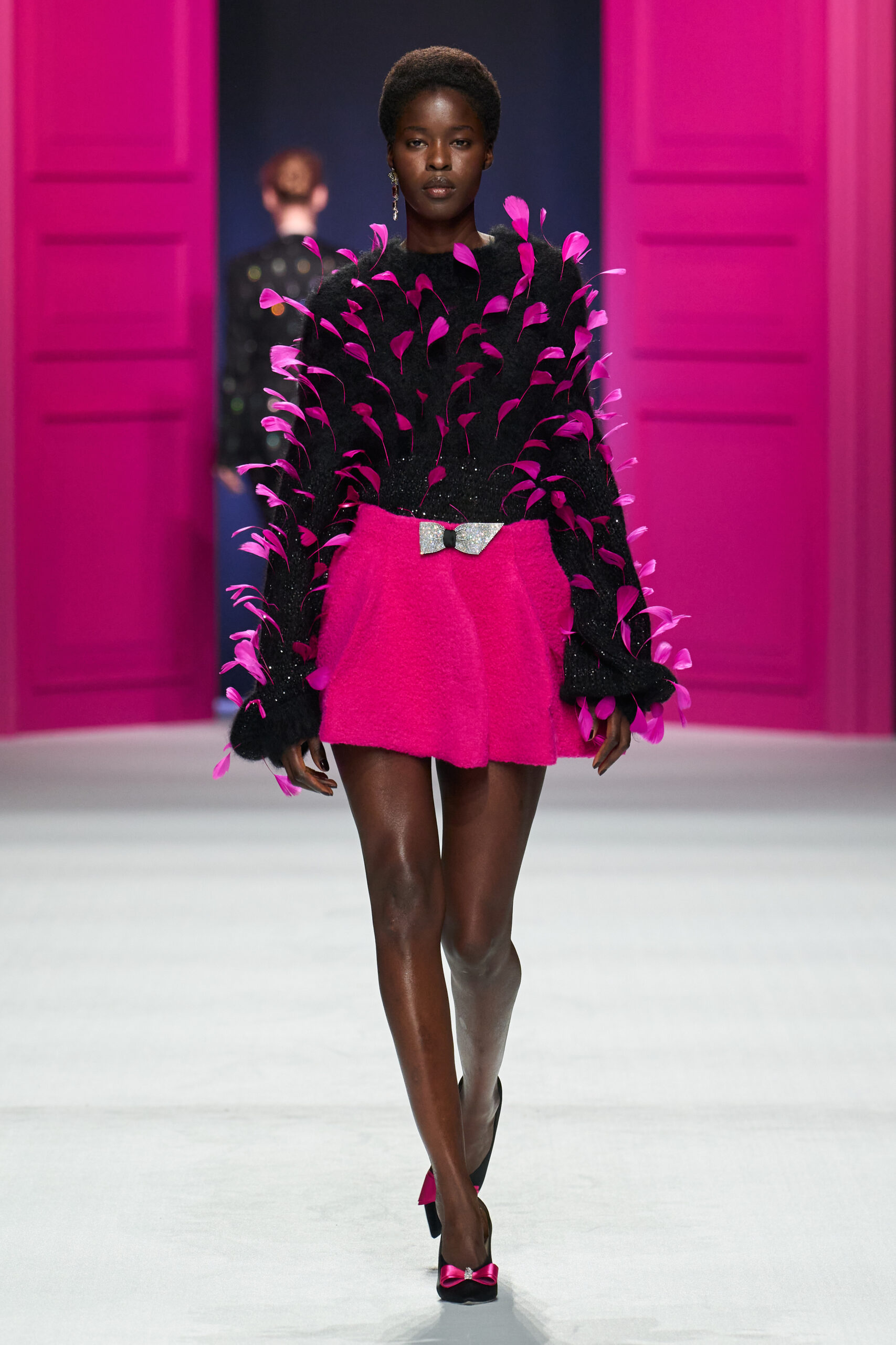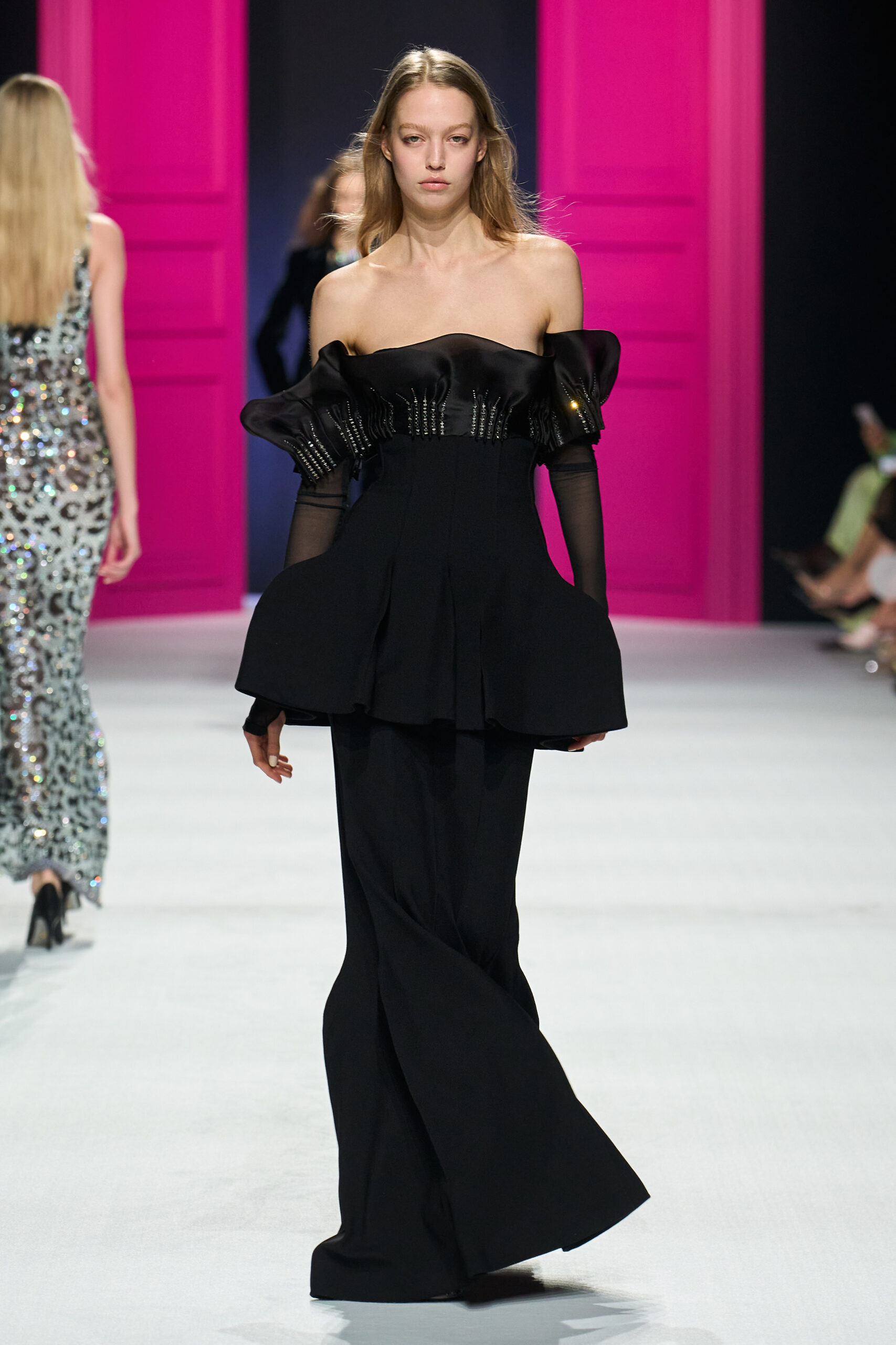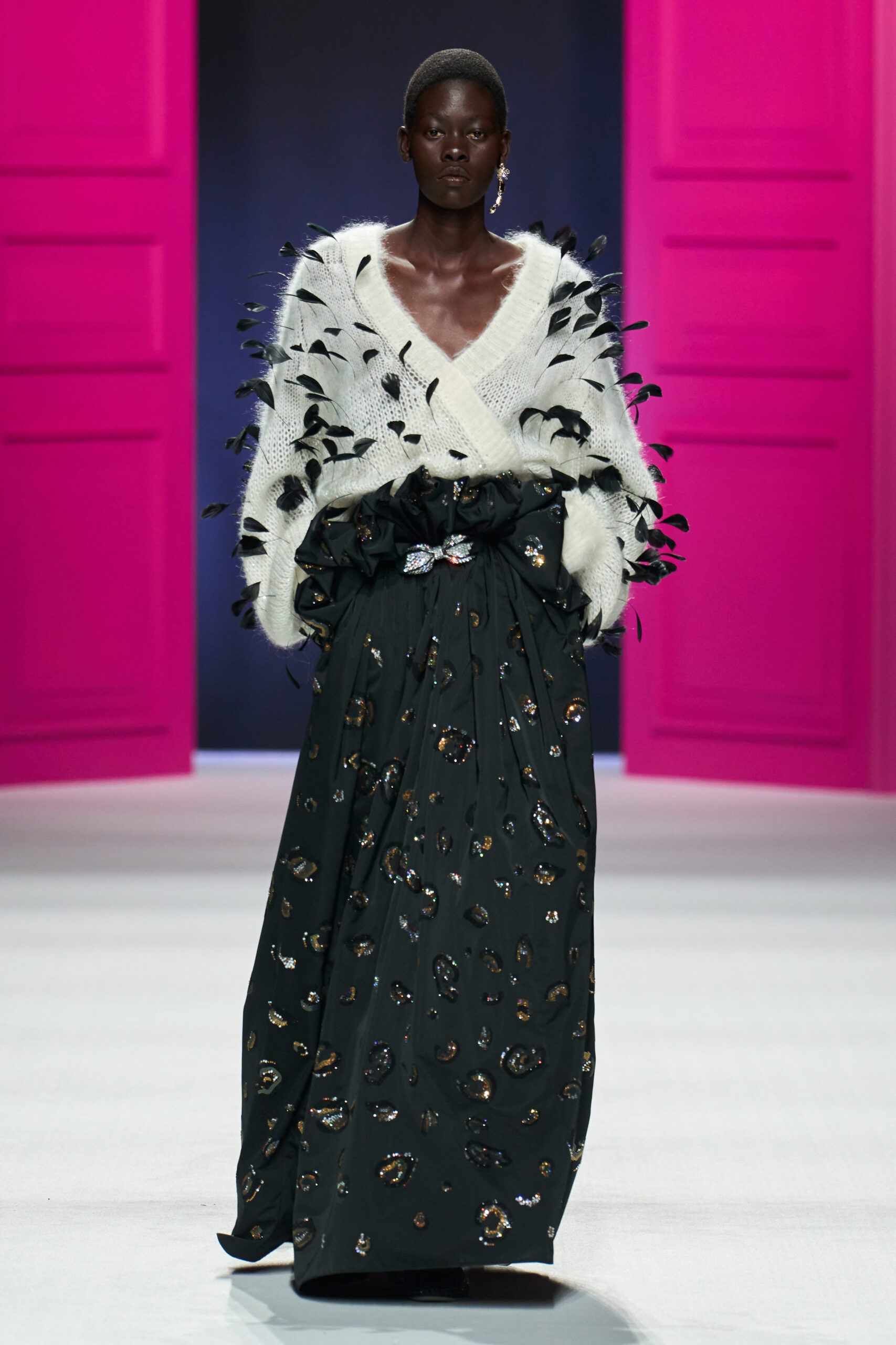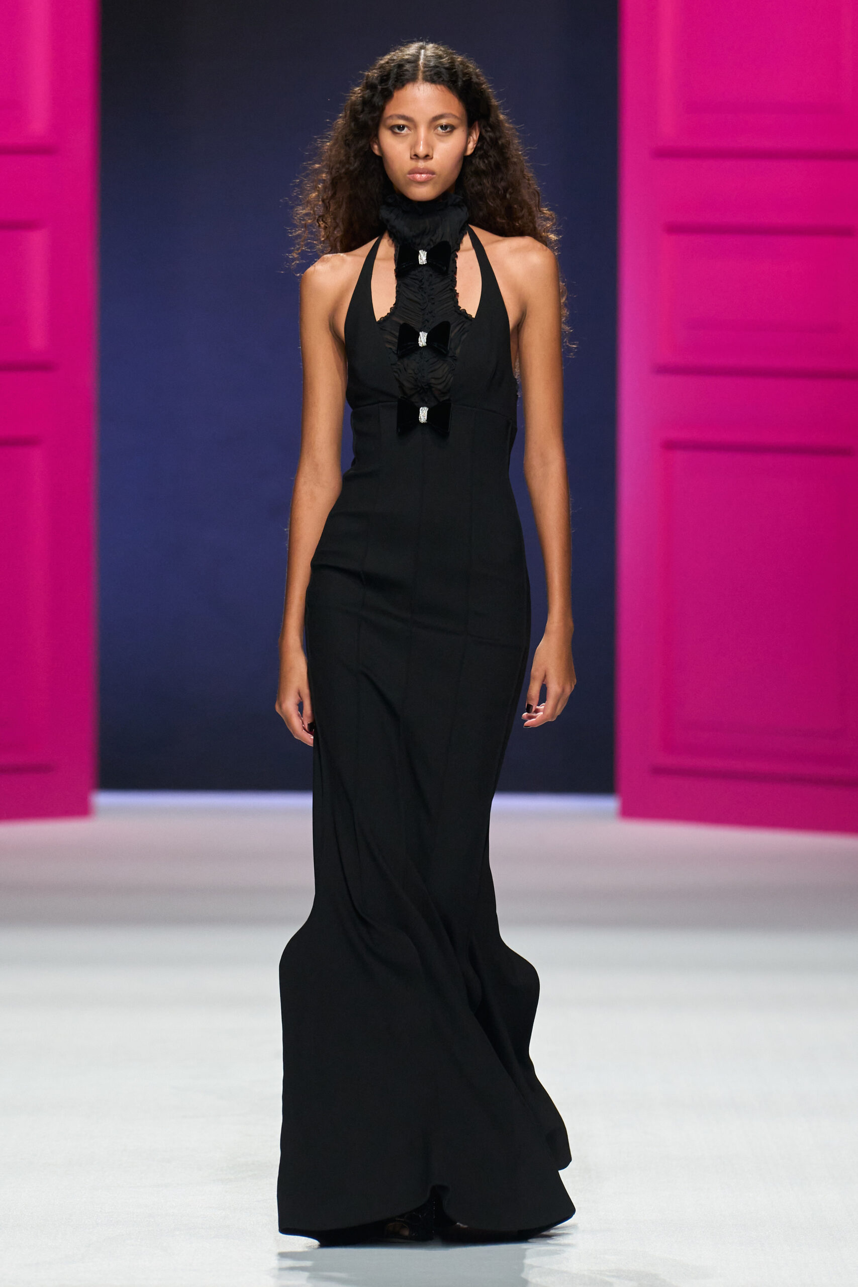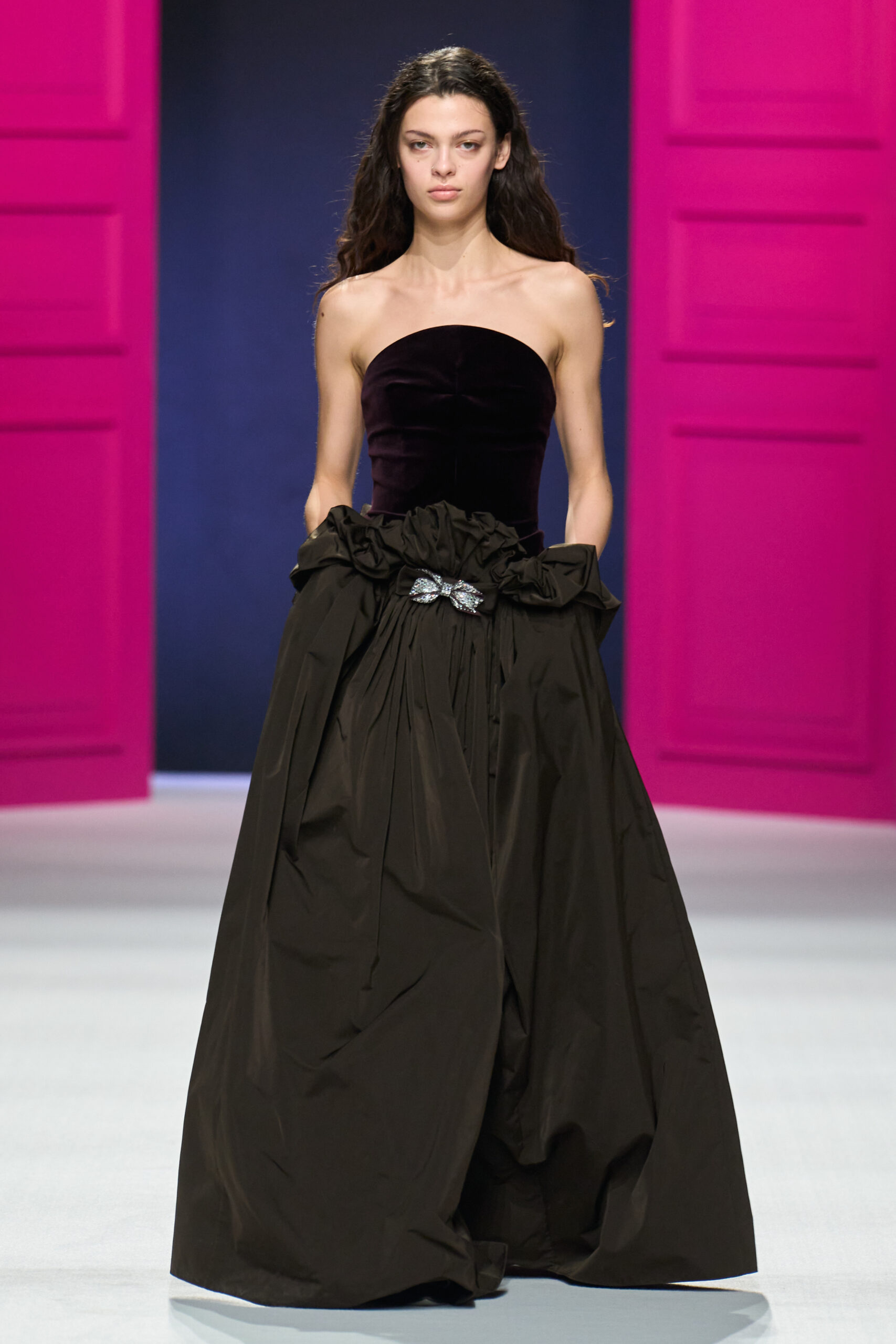 Petali tridimensionali si trasformano in gonne-corolla con volumi che si aprono come architetture botaniche. Il busto rimane asciutto e controllato mentre la parte inferiore esplode nella geometria variabile della natura. Ci sono fiocchi e volant. I primi vengono trasformati in dettagli sartoriali che sostituiscono l’allacciatura di una sensuale camicia bianca dal taglio maschile oppure si allacciano sui revers di una raffinata giacca da smoking.