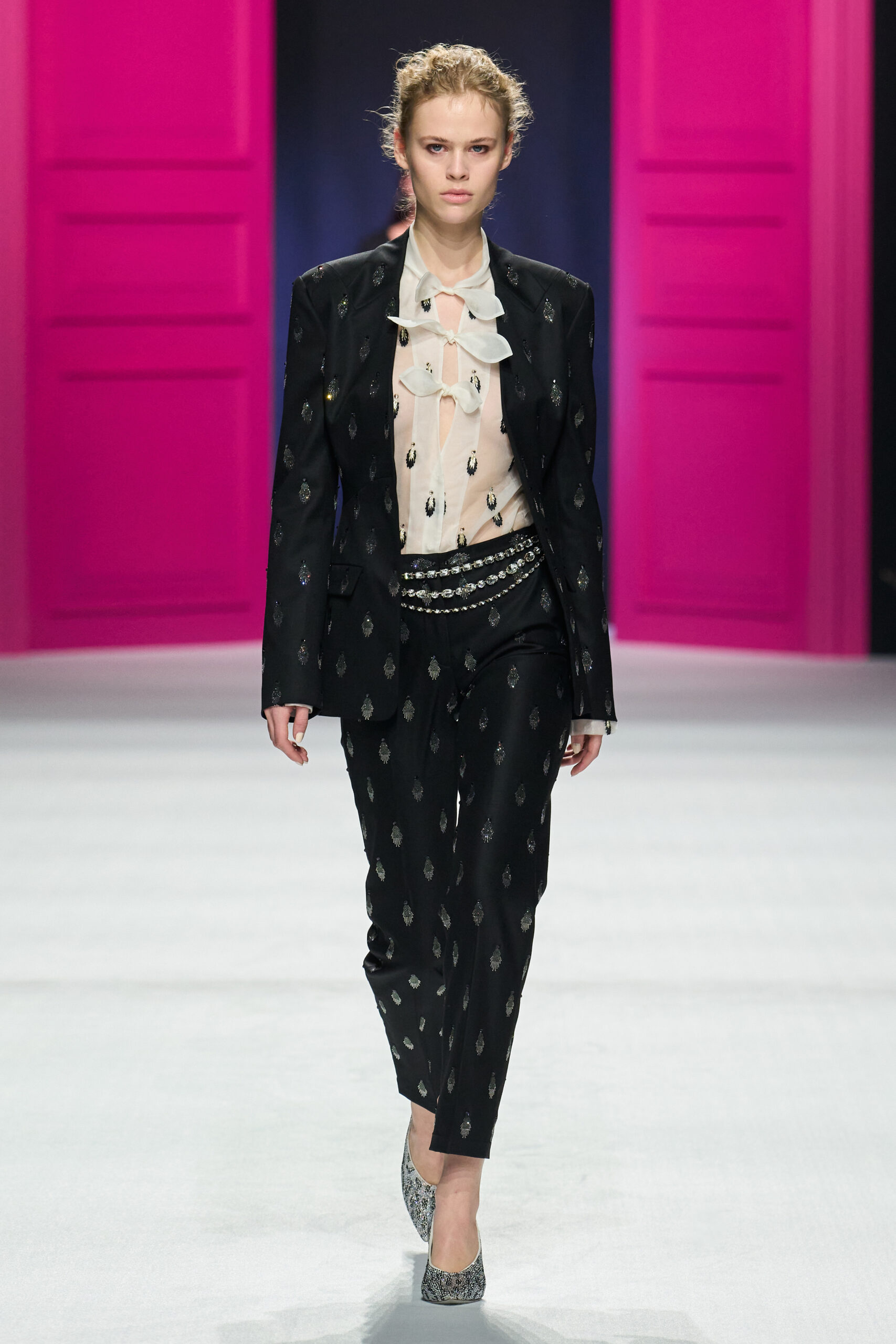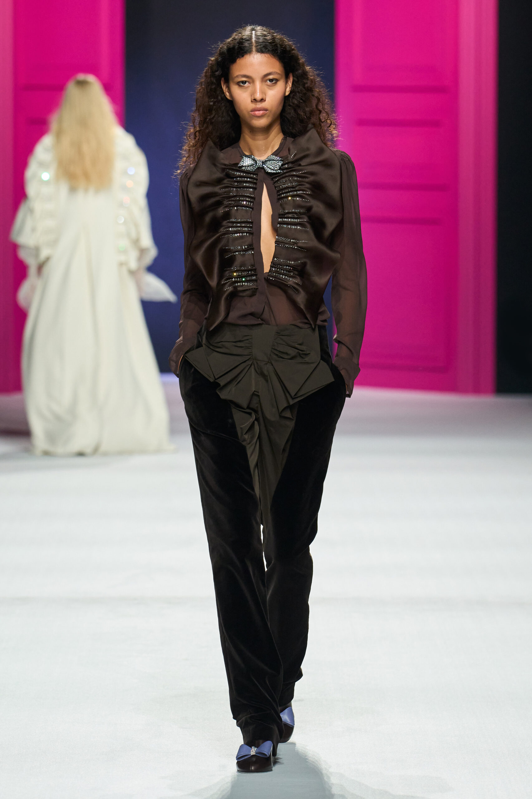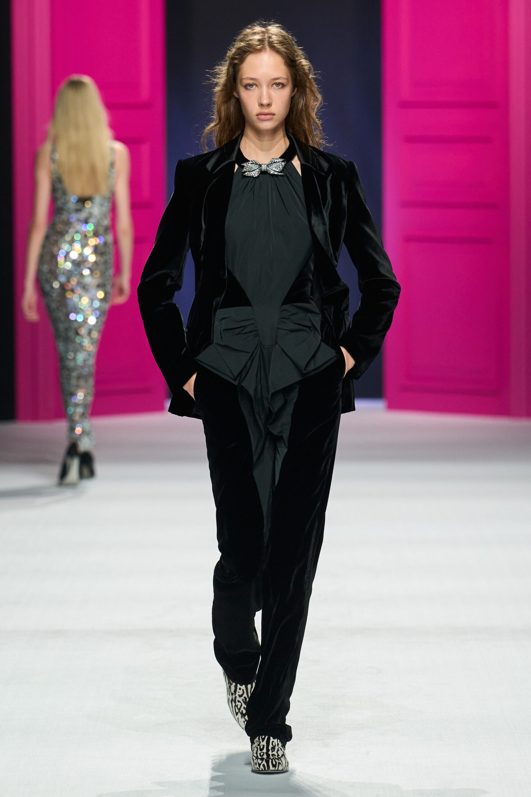 There are bows and ruffles. The bows are transformed into tailored details that replace the fastening of a sensual, masculine-cut white shirt, or they adorn the lapels of a refined tuxedo jacket. Ruffles, on the other hand, replace