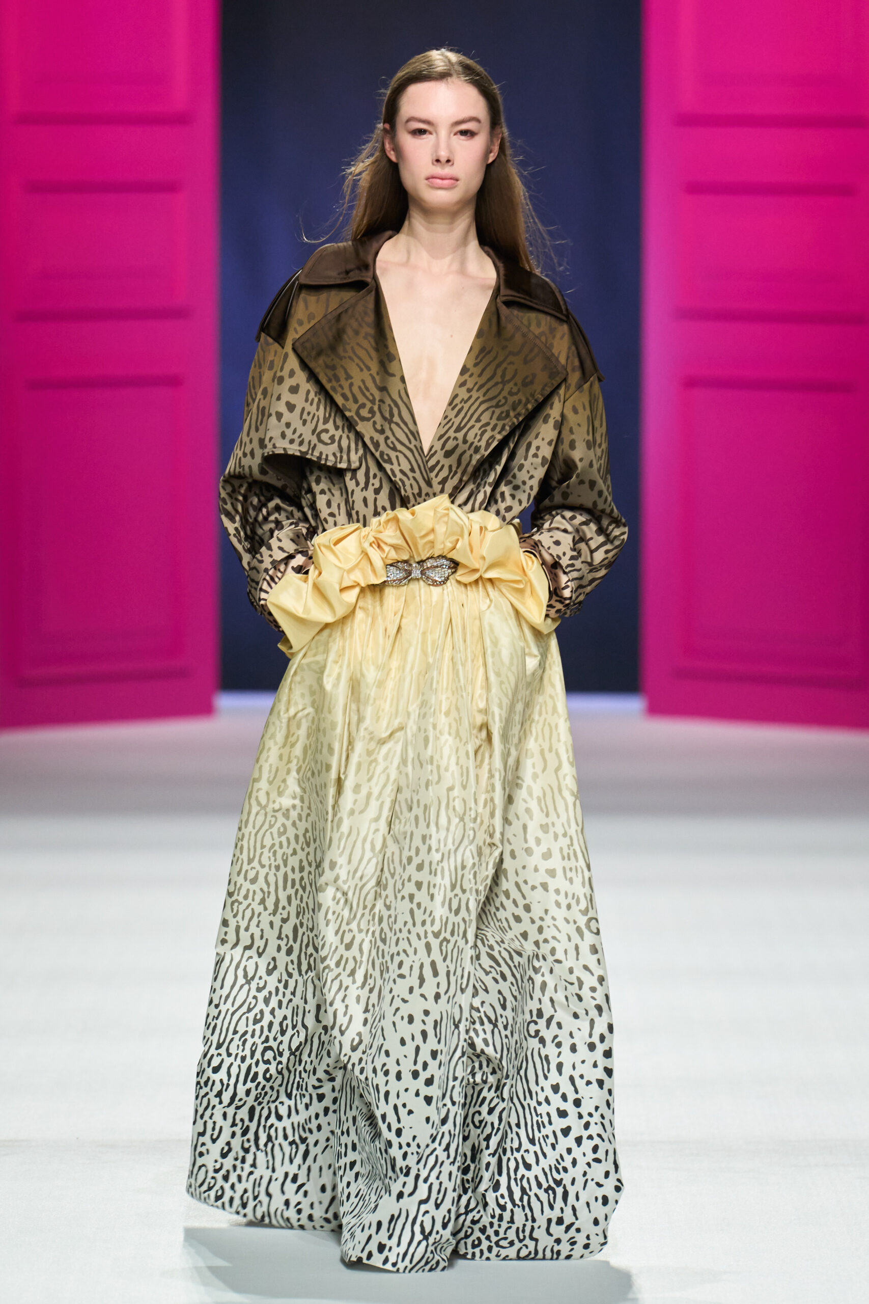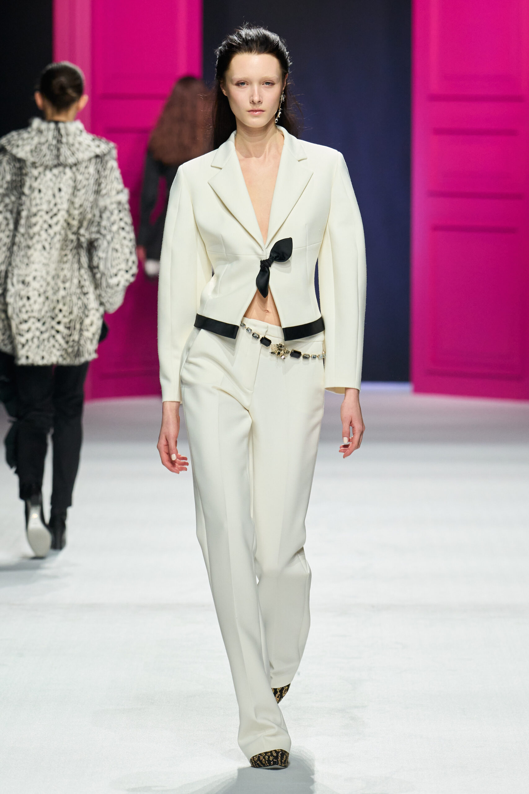 L’animalier — già presente come eco istintiva — si dissolve ora in toni sfumati, quasi ombre naturali che attraversano i tessuti senza mai diventare aggressivi. Fiocchi importanti applicati come spille su camicie e abiti, un segno grafico per interrompere la linearità del completo maschile. Sul fiocco il rigore si piega e si rende consapevolmente estetico.