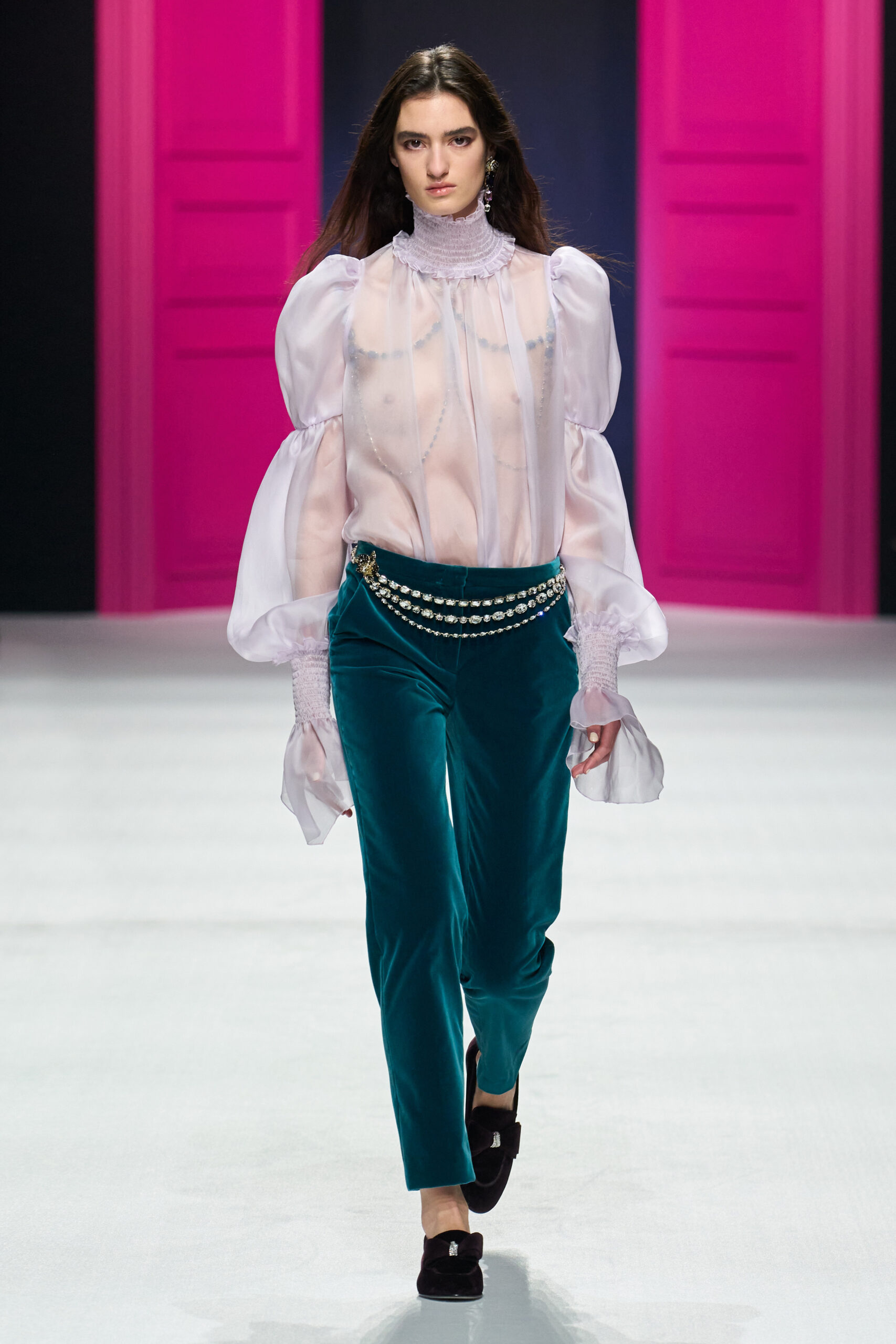Il punto di partenza della collezione Genny A/I 26/27 è qualcosa che viene da lontano: la moda lanciata durante il Direttorio (1795/1799) da “Les Incroyables e les Merveilleuses”. Erano persone talmente rigorose nella continua ricerca di un’immagine assoluta e piena di regole da rispettare che il loro stile ha poi determinato la nascita del dandismo. Il guardaroba maschile fatto da blazer affilati, gilet strutturati, pantaloni impeccabili e camicie dagli alti colli viene riletto sul corpo femminile con una precisione quasi architettonica. La silhouette è verticale, composta, misurata. Ma la disciplina non è mai sterile: dal centro della costruzione sartoriale emerge il fiore. Non è stampato né decorativo, ma scultoreo e monumentale.