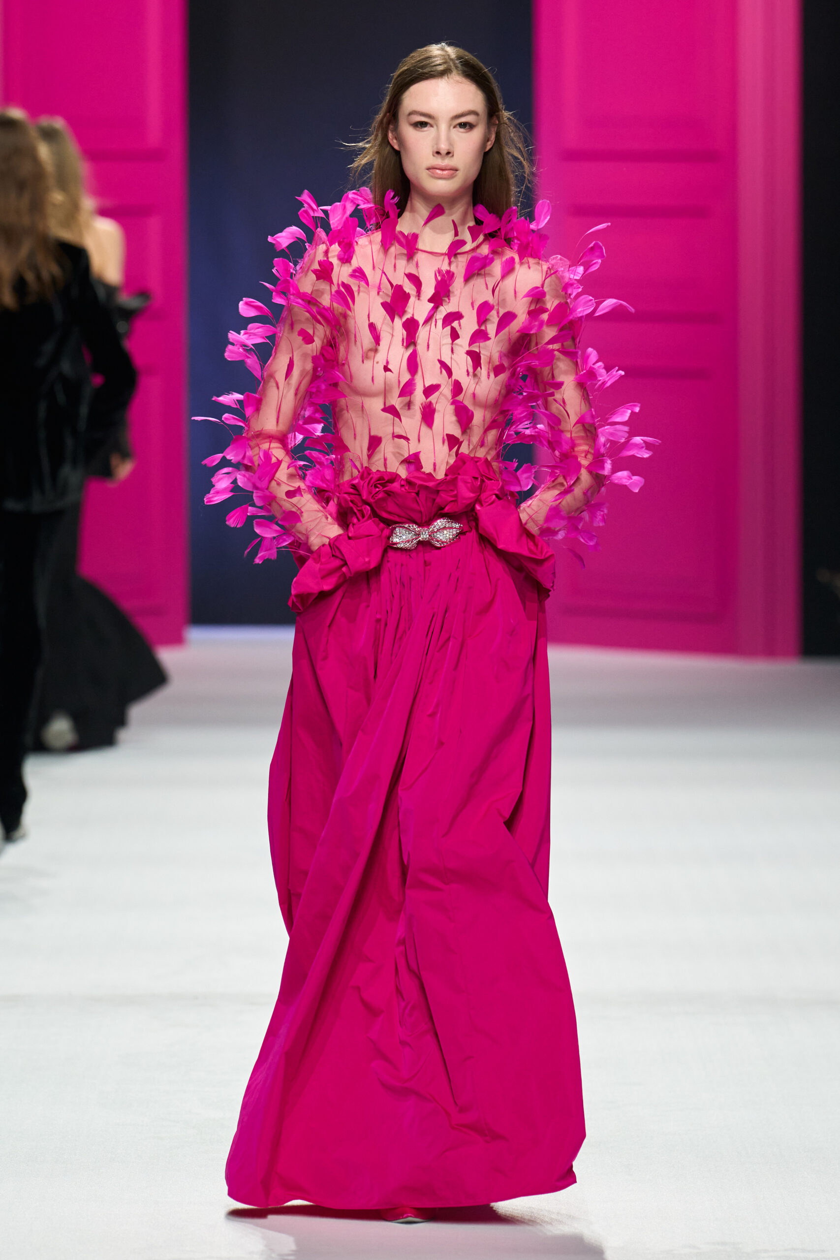 Three-dimensional petals transform into corolla skirts with volumes that open like botanical architectures. The bodice remains sleek and controlled, while the lower part explodes into the variable geometry of nature.